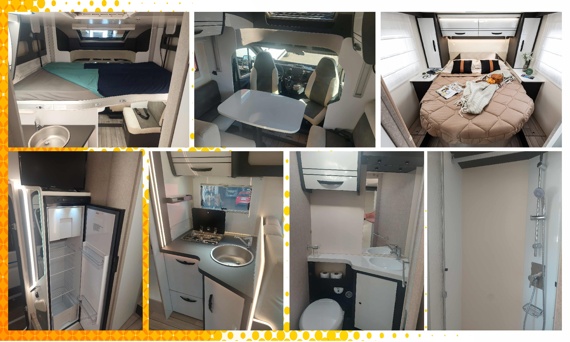 Vaisselle, literie complète, TV DVD TNT, GPS, guides des aires de repos, guide France Passion, meubles de jardin, assistance Europe, gaz et produit WC, porte-vélos, store, nettoyage extérieur et lessive de drap de lit inclus,