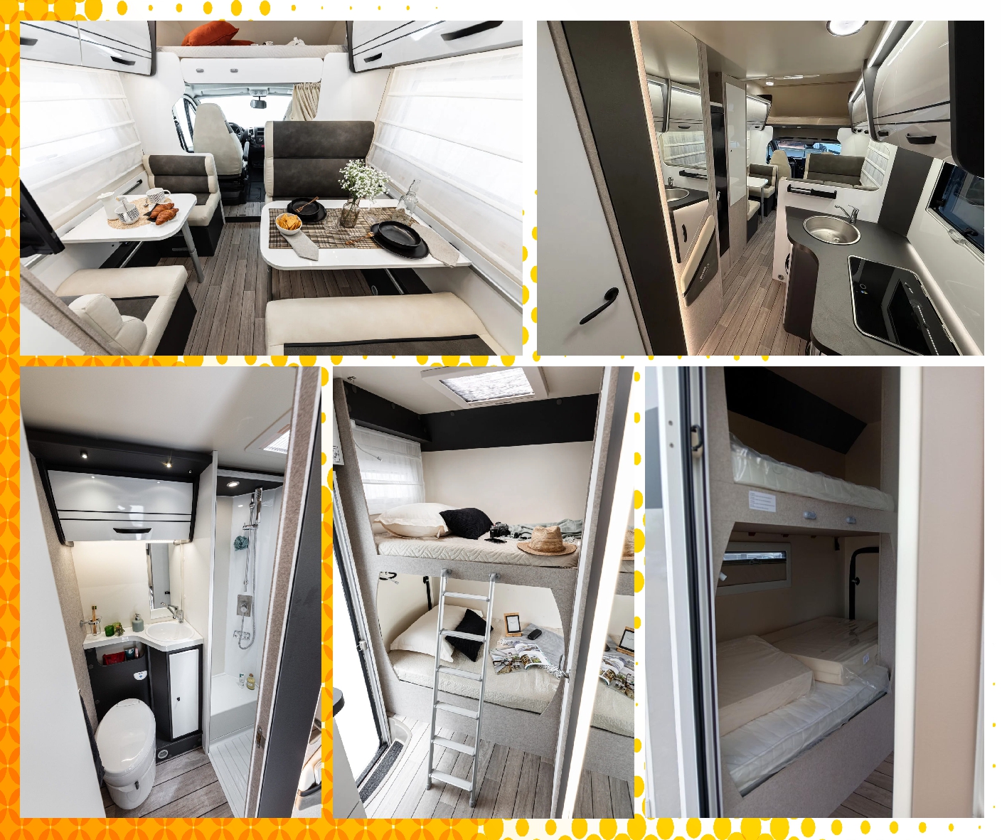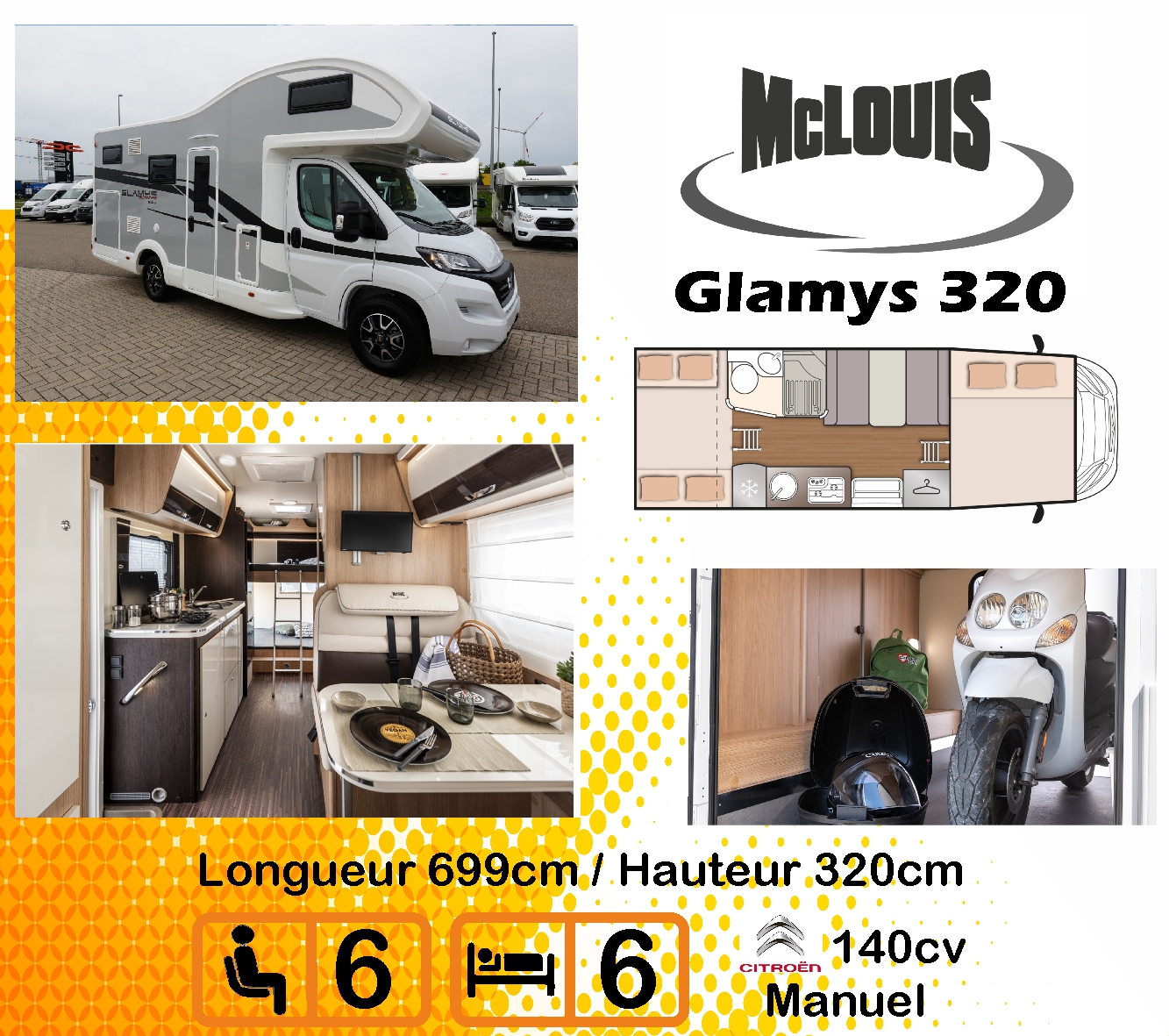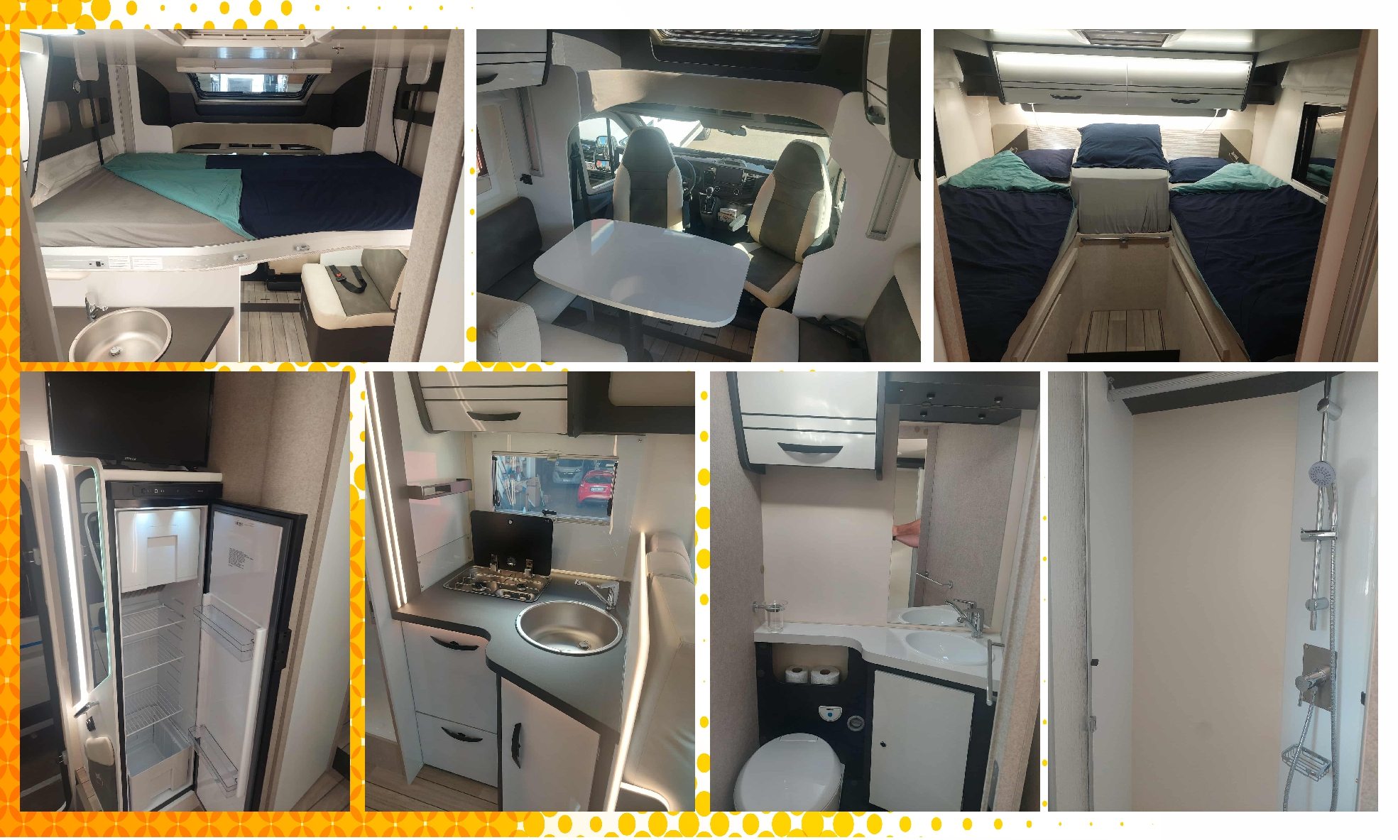 Vaisselle, literie complète, TV DVD TNT, GPS, guides des aires de repos, guide France Passion, meubles de jardin, assistance Europe, gaz et produit WC, porte-vélos, store, nettoyage extérieur et lessive de drap de lit inclus,