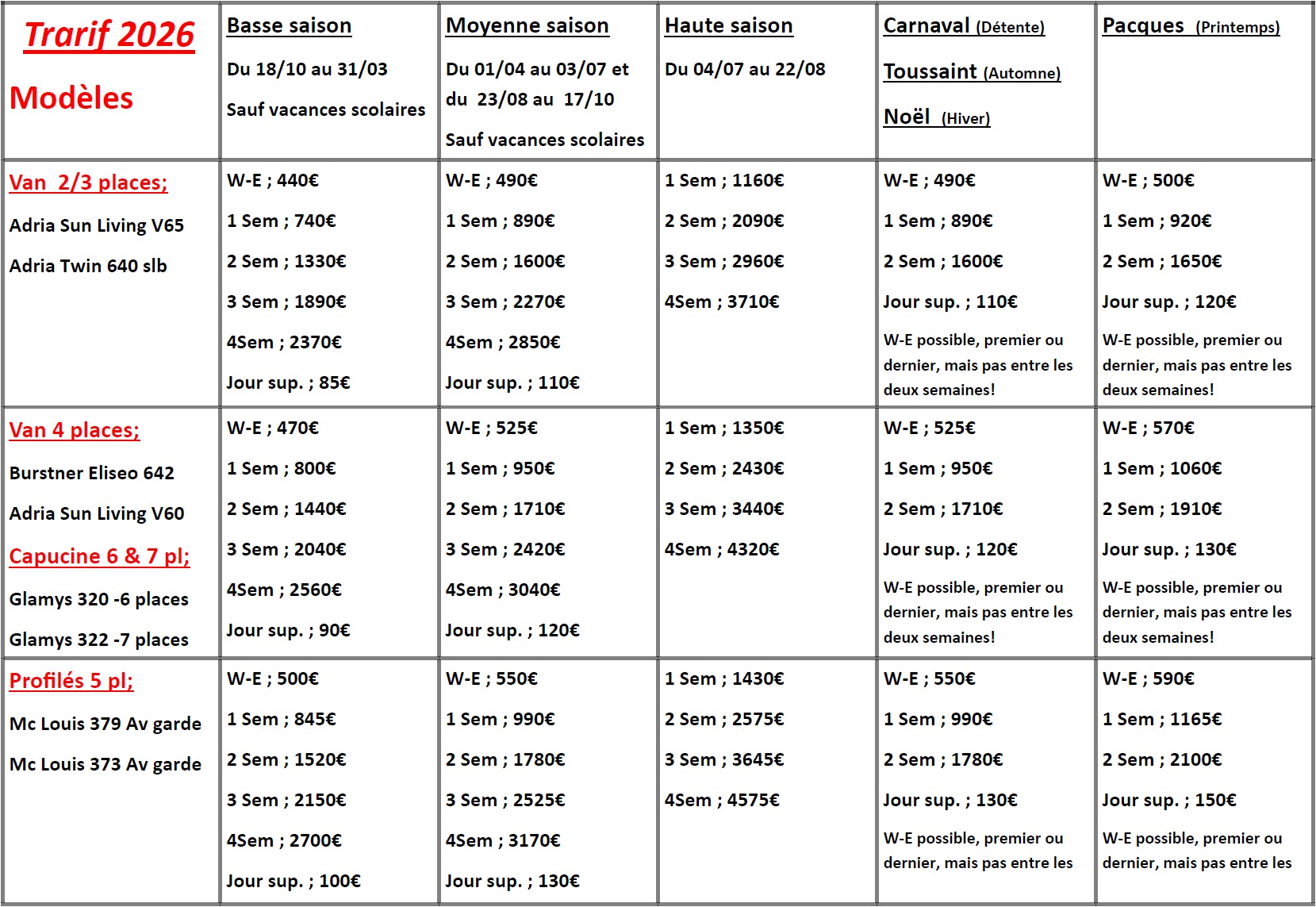 La durée d'un weekend est de 3 jours et 3 nuits. Par exemple, départ vendredi 18h et retour lundi 18h. Ces jours peuvent être différés, et la période peut être prolongée. Pas de location le weekend en haute saison.